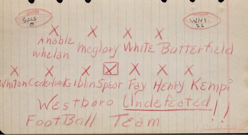 Winter in the USA means a few things, no matter the climate: holiday season, and football. New Englanders have been particularly enjoying the Patriots’ return to the playoffs this month, but the game is beloved well beyond the professional game. To that point, here’s a unique item the Statewide program had the pleasure of working on: a hand-drawn playbook dating to 1943, used by generations of Westborough High School football coaches.