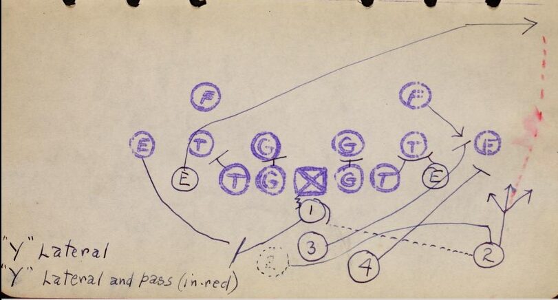 The book is not exclusively for strategy, though — the above page memorializes an undefeated Westboro High team likely from the 1940s or 1950s. There are also records of the team’s intense practice regimen from Monday through Friday. The page below is one of the many diagrams in the book. Note the stamps used to mark offensive lineman and defensive players! The plays can be difficult to parse out for the uninitiated (including this writer), but this tricky play features a player lined up at wide receiver receiving a lateral from the quarterback, and throwing to the other wide receiver cutting across the width of the field!